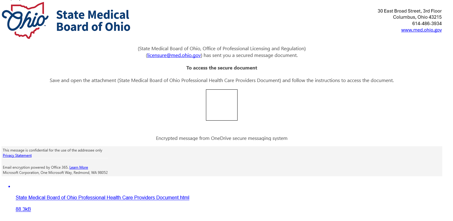 Licensees should remain vigilant against the resurfaced spoofing and extortion scams targeting Ohio providers. Recently, the board has received reports of scammers emailing licensees to access a secure document via an included hyperlink (see example below). Additionally, scammers are posing as Medical Board staff, stating the provider is being investigated by the FBI or DEA and their license has been suspended.